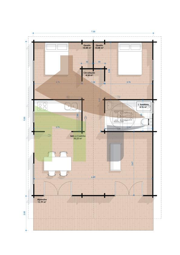 A Casa de madeira modelo Nicola é um T2 com 1 casa de banho, e muito espaço. Com 63 m2, apresenta-se como um modelo muito interessante para quem procura um T2 com bom design.