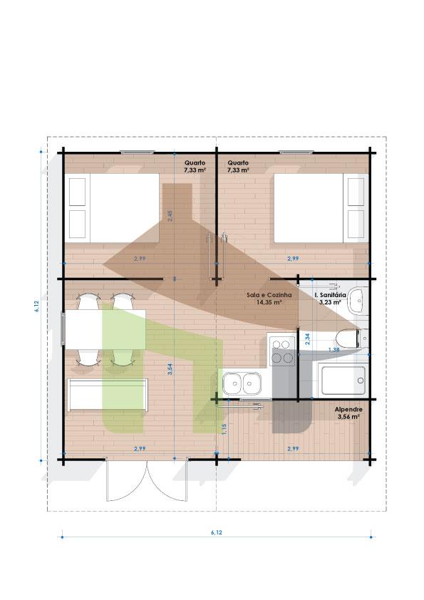 A Casa de Madeira Simona T2 é uma confortável pequena casa, a um preço reduzido. Prática para férias ou habitação própria permanente. Um modelo bastante usado para turismo devido a sua rentabilidade. E Retorno do investimento